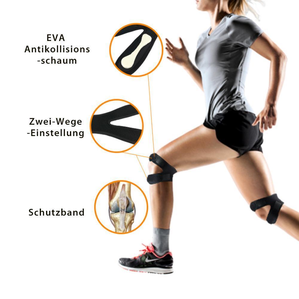 Das untere Kompressionsrohr zielt auf die Patellasehne ab, und das obere Kompressionsrohr zielt auf eine Quadrizepsfehlausrichtung ab, um die Patellaspurhaltung zu verbessern.