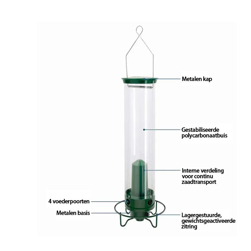 Der Vogelhäuschen besteht aus einem robusten Metallsockel und einer Kappe. Das Saatrohr besteht aus UV-stabilisiertem Polycarbonat und verblasst nicht.