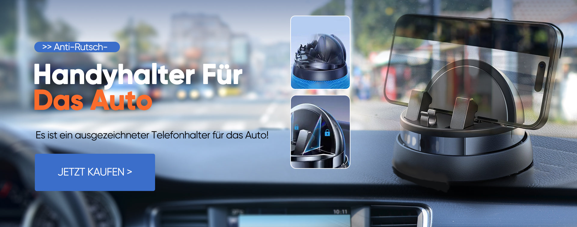 Gebrauchstipps: Ziehen Sie die Klebefolie an der Unterseite des Handyhalters ab und stellen Sie sicher, dass die Oberfläche Ihres Armaturenbretts trocken und sauber ist (kein Staub), bevor Sie den Halter anbringen. Diese Autohalterung unterstützt nur den horizontalen Gebrauch.