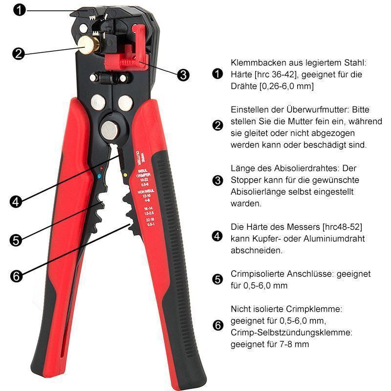 Das einzige Werkzeug, das alles macht. Dieser Abisolierzange erfüllt alle Ihre Kabelanforderungen! Es schneidet, verpresst und streift nicht nur alle Arten und Größen von Drähte, sondern passt sich auch selbst an.