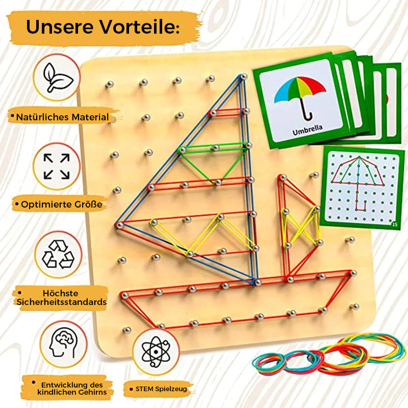 Dieses Spielzeug wird kleine Kinder begeistern und beschäftigen. Es ist ein einzigartiges und lehrreiches Werkzeug, mit dem Kinder Geometrie und mathematische Konzepte auf unterhaltsame und kreative Weise erkunden können. Mit Musterkarten und Gummibändern können Kinder eine Vielzahl von Formen und Figuren erstellen, die sie stundenlang unterhalten.