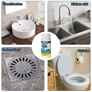 - Es verflüssigt Fette, Öle, Flusen, Papier, Haare und andere organische Substanzen, die zu Abflussbehinderungen führen.
