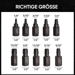 Richtige Größen: Haben Sie immer den richtigen Ausdreher-Bit, wenn es an der Zeit ist, mit gebrochenen oder festgefrorenen Schrauben fertig zu werden. Dieses Set hat Auszieher von 1/8 Zoll bis 7/8 Zoll und jedes Stück hat eine lasergeätzte Markierung zur einfachen Identifizierung.